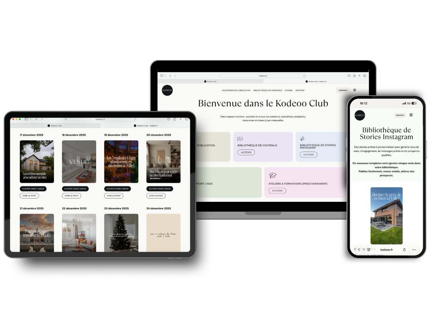Kodeoo Club ne vous donne pas seulement des templates. Nous vous donnons tout ce qu’il faut pour attirer des acheteurs, séduire des vendeurs, décrocher des mandats et devenir la référence immobilière de votre secteur, en ligne et hors ligne.