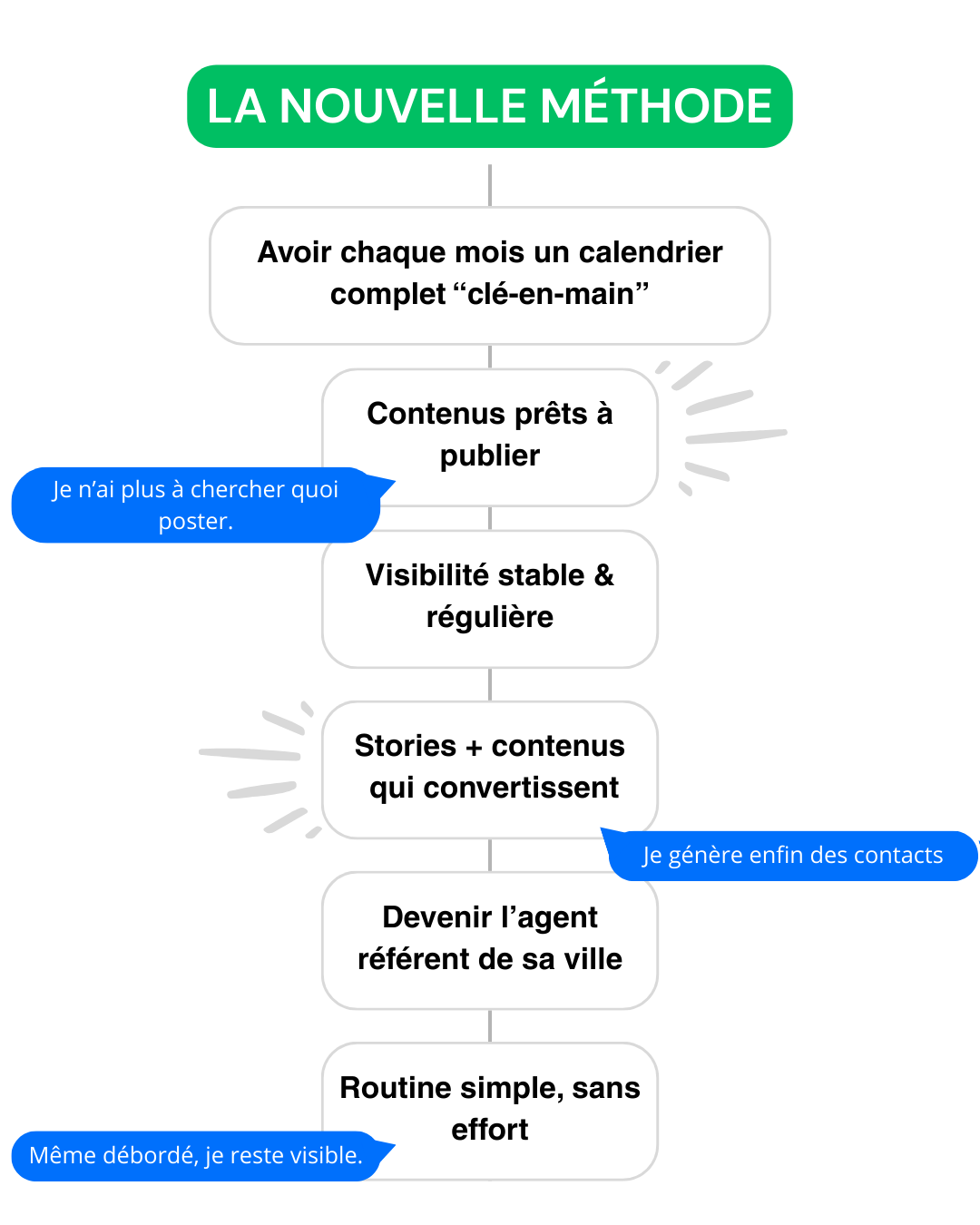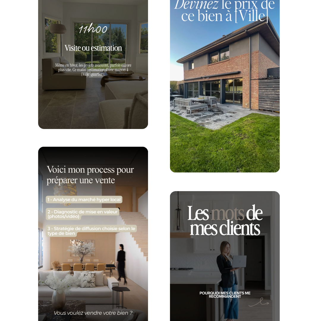 Des stories qui génèrent des messages privés, créent la confiance et déclenchent des prises de contact. Des formats simples, rapides et percutants, adaptés aux conseillers immobiliers.